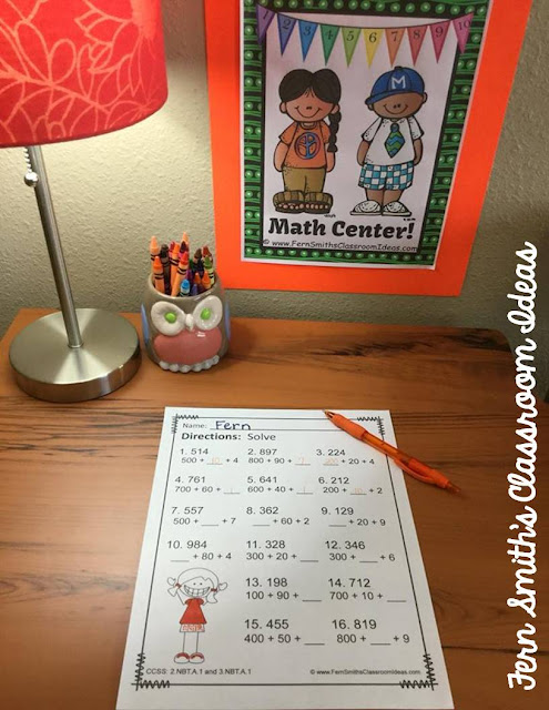 * During math rotations, use page 2, a cute little boy and an adorable little girl solve and color page to review Use the Break Apart Strategy to Add during your student seat work time. Wednesday - Use page 6, the 16 Use the Break Apart Strategy to Add math problems that break the 3-digit number down using their place value skills as morning work. Depending on the level of your boys and girls, they can complete the page alone, in pairs, or in a group. You can have the answer key on the board so that they are copying the correct answers as a very basic, low math level activity. OR Once the boys and girls are done, you, or a student, can project the answer key, covering up the problems and call them out one at a time, while revealing the answer.