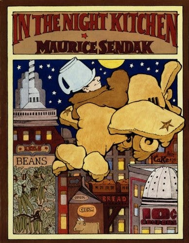 In this 1970 follow-up to Where the Wild Things Are, the dreamer is named Mickey, not Max. The exiler isn’t a parent but sleep itself and instead of Wild Things are a trio of mustached bakers who bake Mickey in an oven as part of a “morning cake.” And yet... yet... there’s so much joy and magic in these pages. Mickey in a suit of warm gingerbread. Mickey in a jar of cold milk. Mickey, e’er grinning, popping up from his cake tin. Controversial since its publication — moralists objected to Mickey’s nudity — In the Night Kitchen continues to invite the reader into its strange slightly ominous yet nevertheless pleasurable reverie. —JDS