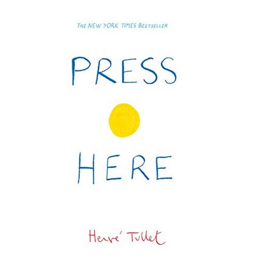 When Herve Tullet’s Press Here came out in 2011 — it was published in French the year prior as Un Livre — children were just on the cusp of living in a touchscreen world. The iPhone was out. Tablets existed. But still, the preverbal impulse to swipe had not yet taken hold. But it’s a testament to the design ingenuity of this near wordless text, that Tullet’s book of colored dots and short directives — press here, turn here, tap this — continues to enchant. One of the best examples of an “interactive” book ever published, Press Here is all a children’s book should be: empowering, entertaining, and enlightening. —JDS