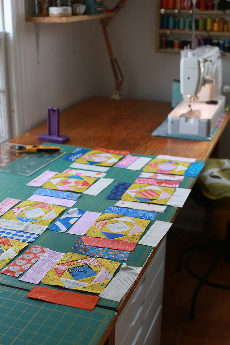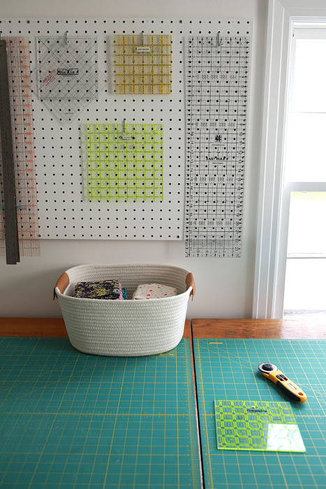 If you're storing your tools on your work table, a system for corralling them is key. Keep it simple with a few mason jars or baskets. Or make yourself a tool caddy. I've made a bunch of the #10 Caddy Pattern* by Sew Can She, they're fun!Patterns + Paperwork